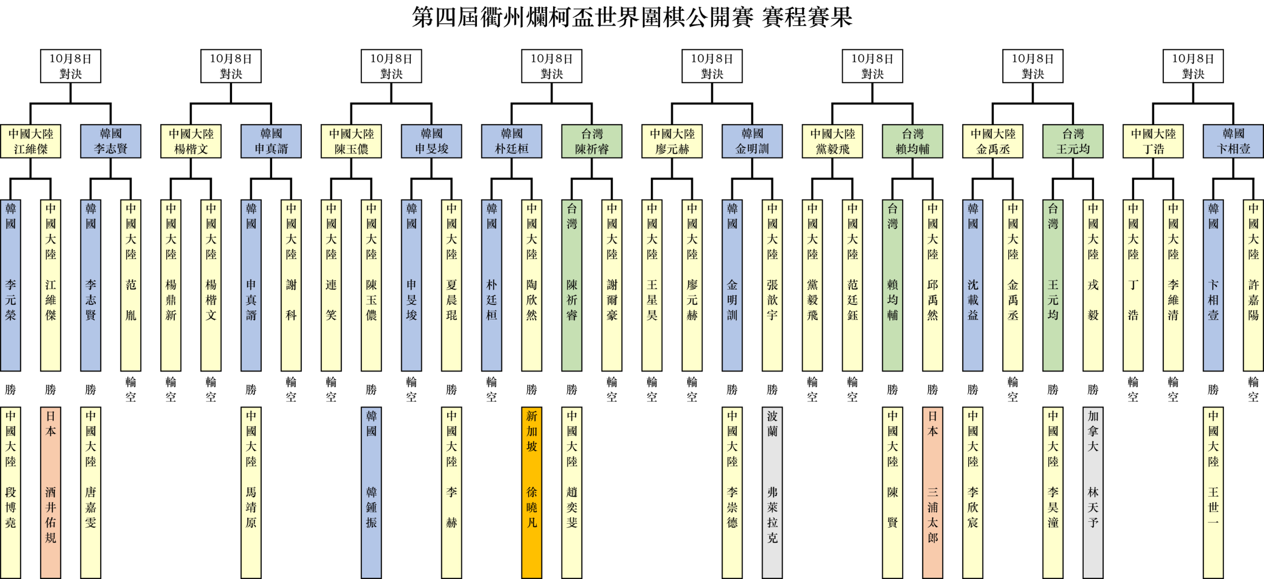 至此,第一階段比賽告一段落,第二階段將從10月9日16強戰起重燃戰火,王元均和賴均輔將繼續面對中國大陸選手的挑戰,分別對陣金禹丞和黨毅飛。陳祈睿則與韓國「棋仙戰」冠軍朴廷桓狹路相逢。