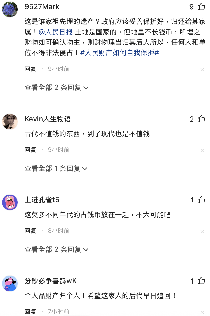 「這是誰家祖先埋的遺產?政府應該妥善保護好,歸還給其家屬!土地是國家的,但地裡不長錢幣,所埋之財物如可確認物主,則財物理當歸其後人所以,任何人和單位不得非法侵占!」