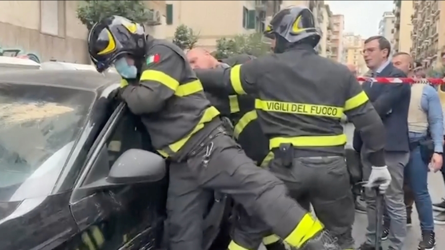 週四,意大利「法國農業信貸銀行」分行外,消防員用力撬開車門,3名劫匪早已從下水道逃之夭夭,不見蹤影。