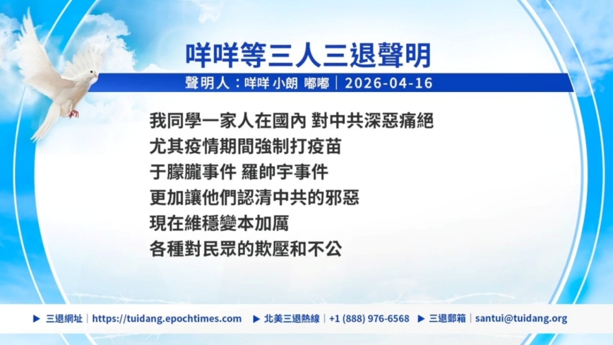 【新唐人北京時間2026年04月17日訊】經歷了疫情,以及于朦朧事件、羅帥宇事件等,中國民眾表示看清中共真相,用化名聲明退出中共組織。來看他們的聲明。