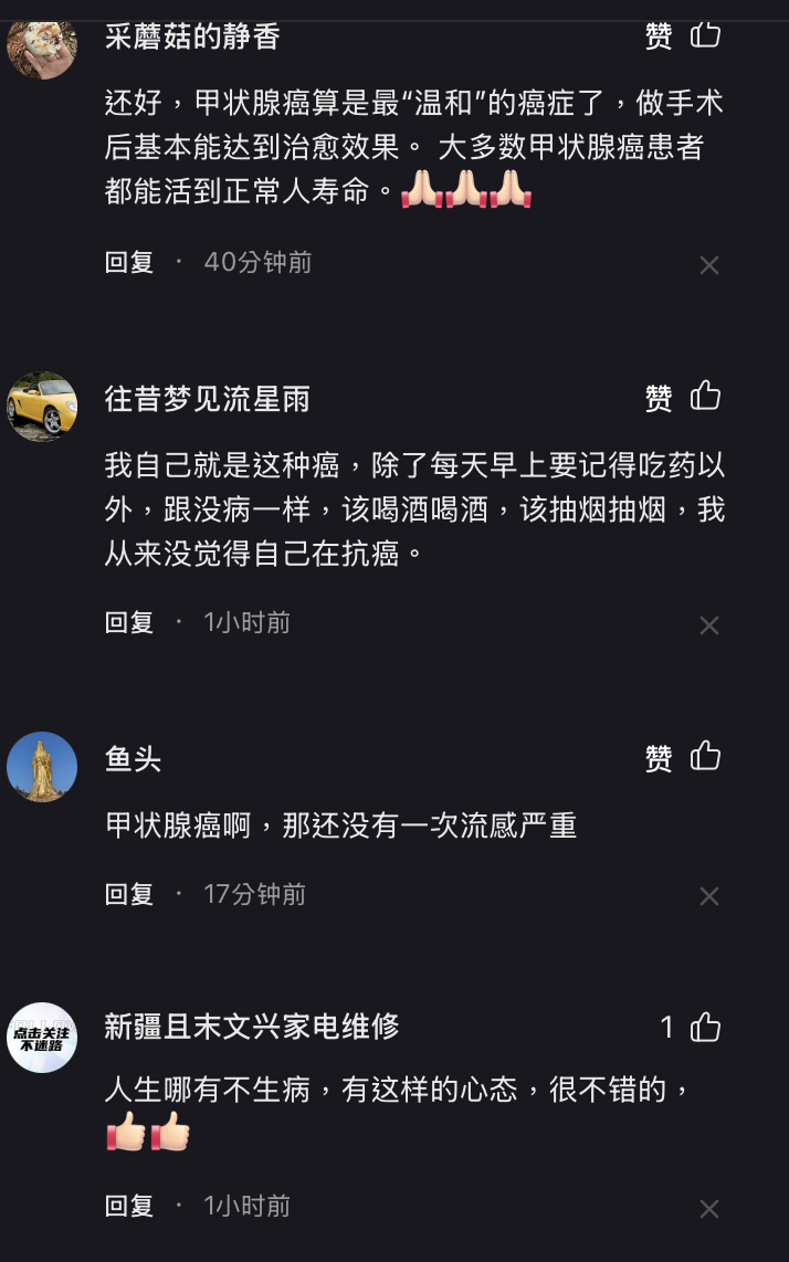 「還好甲狀腺癌算是最『溫和』的癌症了,做手術後基本能達到治癒效果。 大多數甲狀腺癌患者都能活到正常人壽命。」