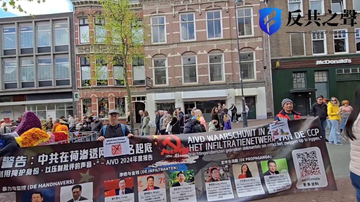 視頻中顯示,多名華人示威者拉起橫幅在街頭抗議,橫幅上寫有:「AIVD(荷蘭情報機構)警告:中共在荷蘭滲透網絡 實名起底⋯⋯」橫幅上有多名中共駐外官員的肖像。