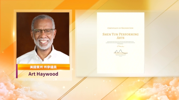 美國賓州州參議員Art Haywood 給神韻藝術團頒發了褒獎:表彰神韻對大費城地區文化藝術發展的重大貢獻。