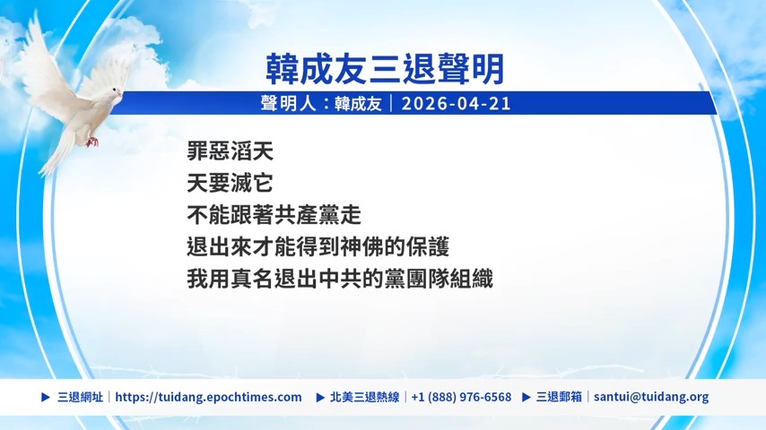 【新唐人北京時間2026年04月22日訊】中國民眾表示,共產黨歷次運動迫害中國人,現在還活摘器官。他們聲明退出中共組織。來看他們的聲明。
