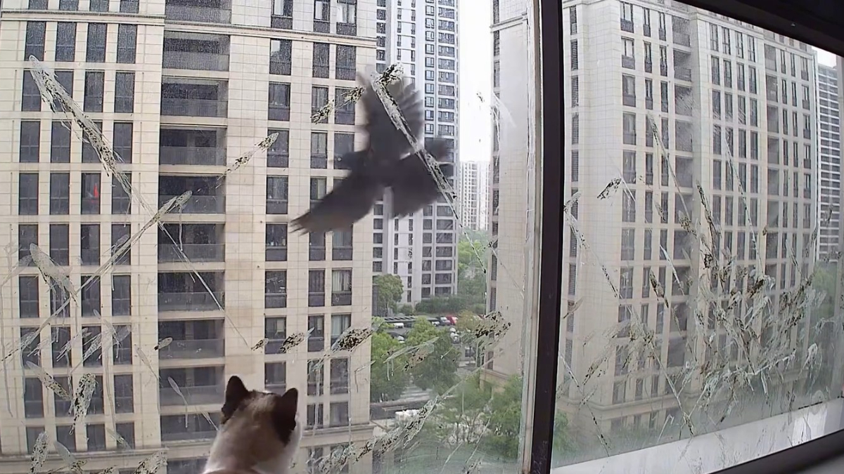 監控視頻顯示,早上8點左右,一隻烏鶇一閃飛過,陽台玻璃上留下一道道屎跡。陽台上一隻貓則盯著飛過的烏鶇。這位網友發文求助說,「怎樣才能把這鳥趕走?」