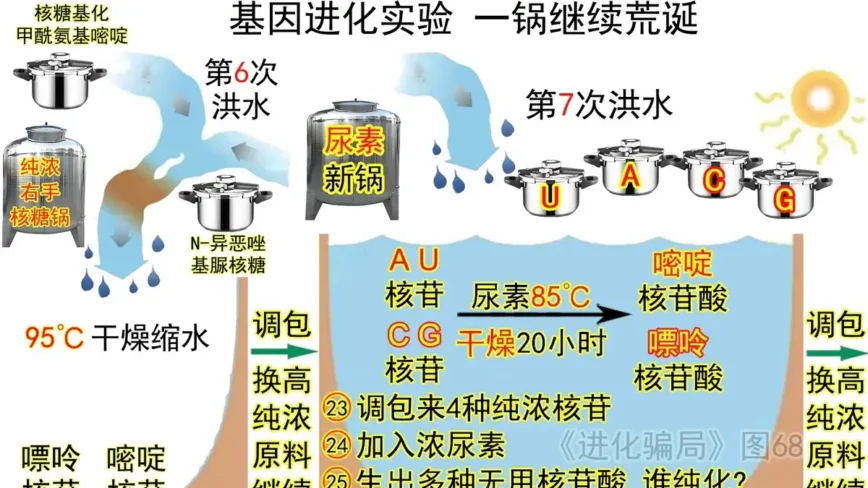 見上面置頂圖,按一鍋進化的邏輯,必須有高濃度的尿素存在。上篇分析過,為保證原料高濃度,以利於化學反應,721kg純尿素(自然界不存在)在6次洪水運送損失中,已經全部耗盡,才能生成萬億分之一M(皮摩爾/升)級的核苷,現在要製造核苷酸,已經沒尿素了,需要一個新的、防雨的、防腐的不鏽鋼尿素鍋,在D鍋邊守候!