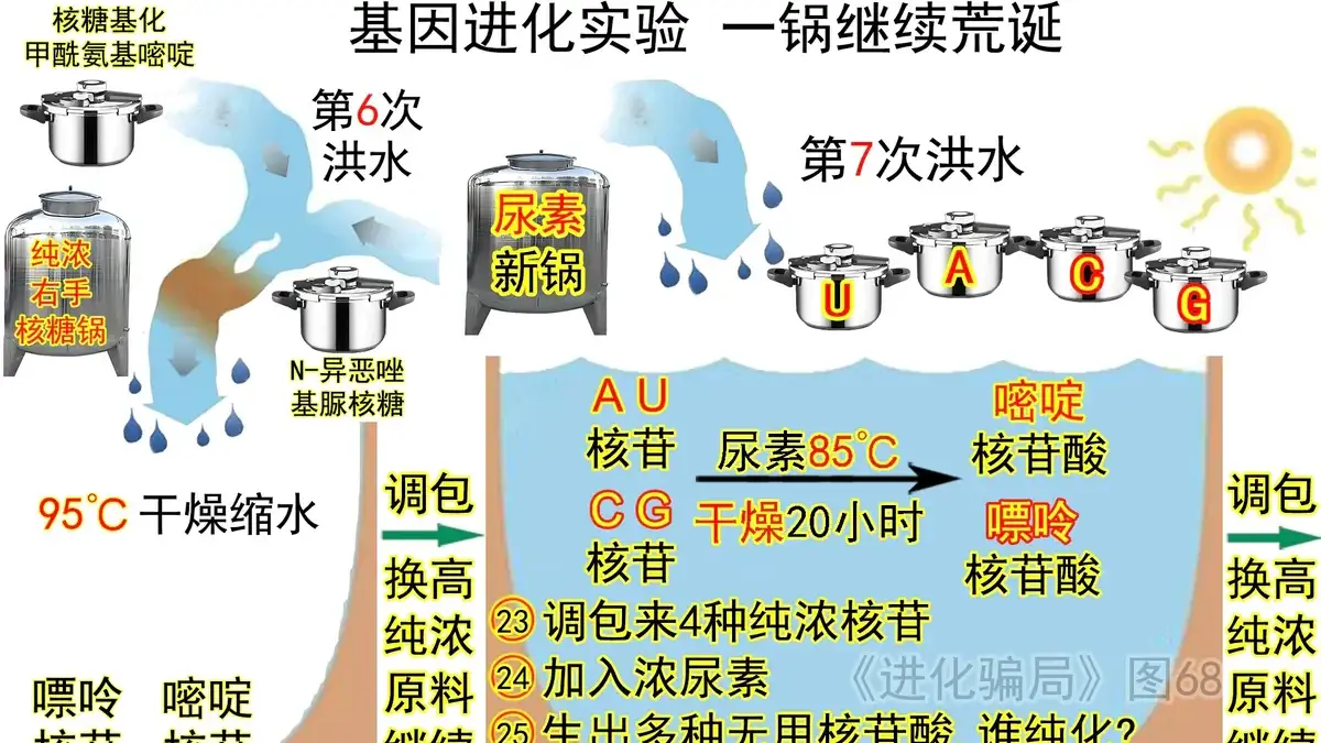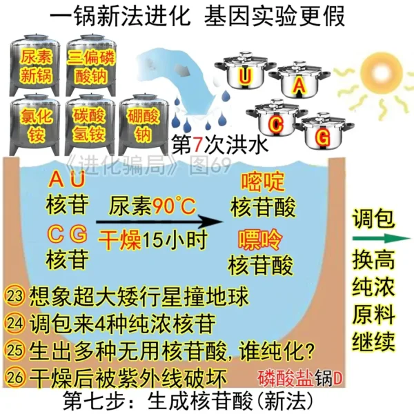 假設33:洪水把C鍋的微量核苷沖入D鍋,同時沖來濃尿素,然後加熱到85℃乾燥20小時,就能生成4種核苷酸——實際不可能,自然界沒有純濃尿素,一鍋反應的微量原料(核苷),在洪水下損失(至少99%,前文已實驗)沒了,除非調包來4鍋純濃核苷。
