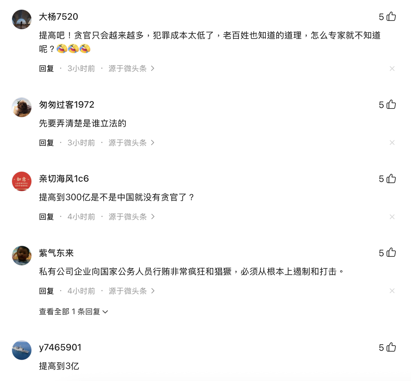 「最應該改的是貪官判死刑的條文,貪1000萬的一律執行死刑!!!」「相對於現在抓到的貪官污吏所查出來的不明財產,這個調整還是有點保守。」「送菸酒到3萬都判刑,大醫院,醫生收紅包,一次都收幾千甚至上萬,每月都幾十萬怎麼算?」「現在太亂了大官大貪小官小貪,全國要建上千座監獄。」