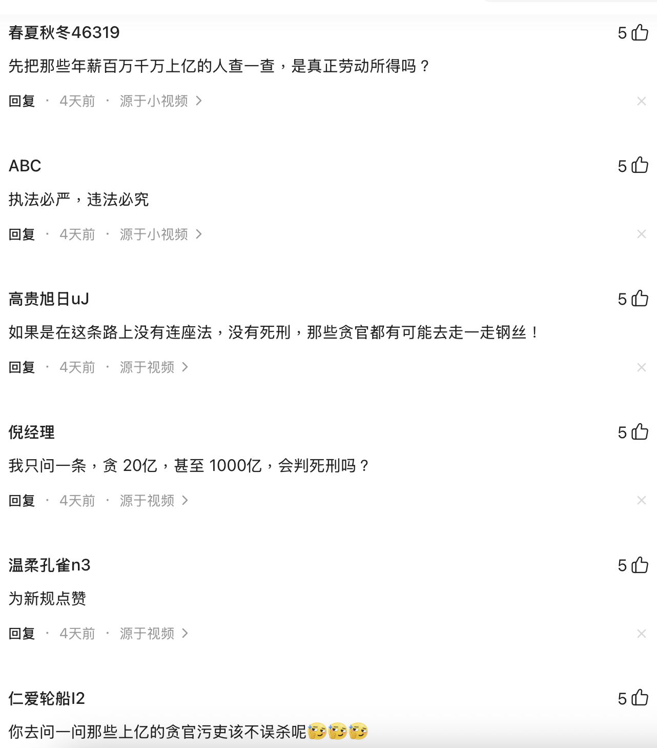 「把貪官污吏全抓起來判刑入獄,騰出來的崗位讓每年的大學畢業生就業,以免應屆生滿街跑外賣。」「首先公布官員的財產,收入,凡不相符的追查到底。」「那貪幾千萬,幾十個億的是不是應該斃了?」「我問一下,數額上千萬、上億的能恢復死刑嗎?如不執行死刑,對小貪官不公平。」