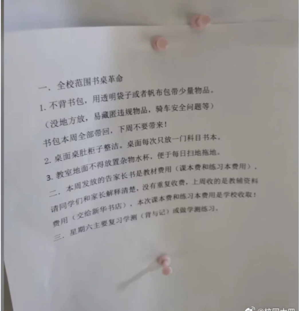 網傳一則該學校通知稱,自明天起,所有走讀生禁止背書包進入校園,讓家長為孩子準備透明塑料帶,用來裝當天所需的學習用品。通知還稱,早上,學校會在校門檢查,違規攜帶的書包將統一暫扣、以標籤登記班級和姓名,晚上領回。