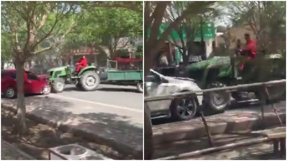 近日網上傳出一段視頻顯示,一名紅衣男子開著拖拉機逆向行駛,將一輛紅色私家車頂到路邊,並多次撞擊,期間還一度衝向路邊的行人。將這輛車撞毀之後,拖拉機又撞向路邊停放的一輛白色私家車,然後又去追撞路中央圍觀的行人。行人慌忙逃離。