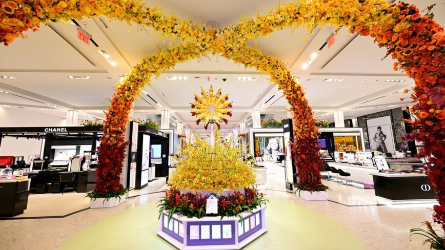 走進梅西百貨,一座巨大的花藝拱門映入眼簾。色彩由鵝黃緩緩過渡至熱烈的紅,像季節的流轉,將人帶入春與夏交會的瞬間。拱門下,三色圓形花輪翻轉,吸引人們駐足留念。