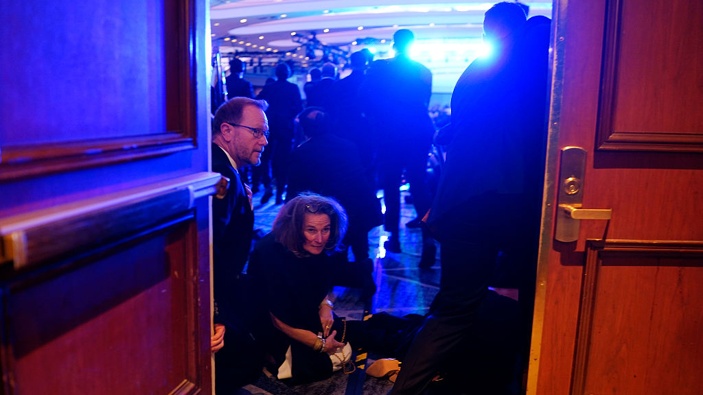 槍響後,宴會廳內陷入一片混亂,可以看到配槍的特勤局反擊突擊小組(CAT)武裝人員站在舞台上,槍口瞄準大廳後方。晚宴參與者紛紛躲到桌子底下。