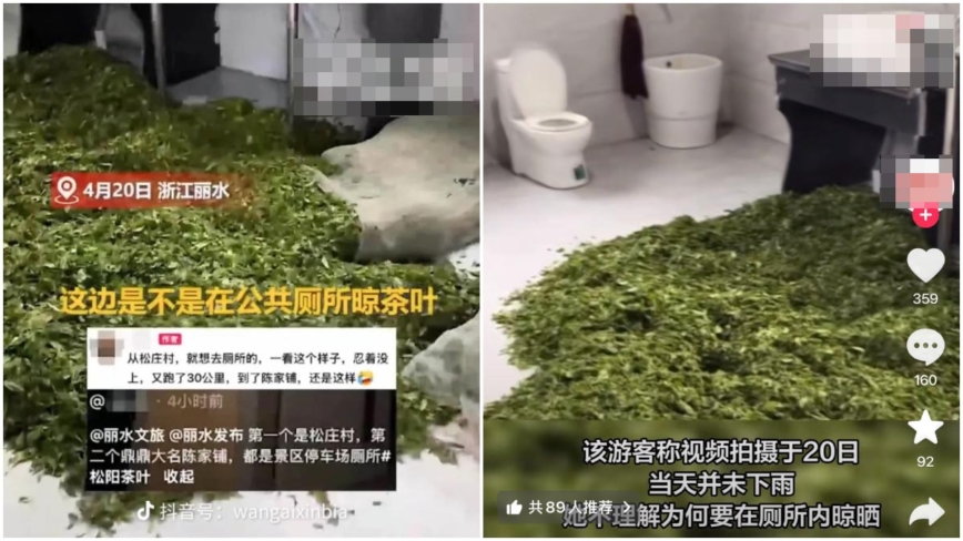4月21日,一名女遊客將20日拍攝的影像發到網上,並發文爆料說,自己當天去浙江麗水一個景區遊玩,因為肚子痛上厠所,發現臭氣熏天的停車場公厠內,從門口到隔間,直到衛生間的地上都鋪滿綠色的茶葉,幾乎連落腳的地方都沒有。