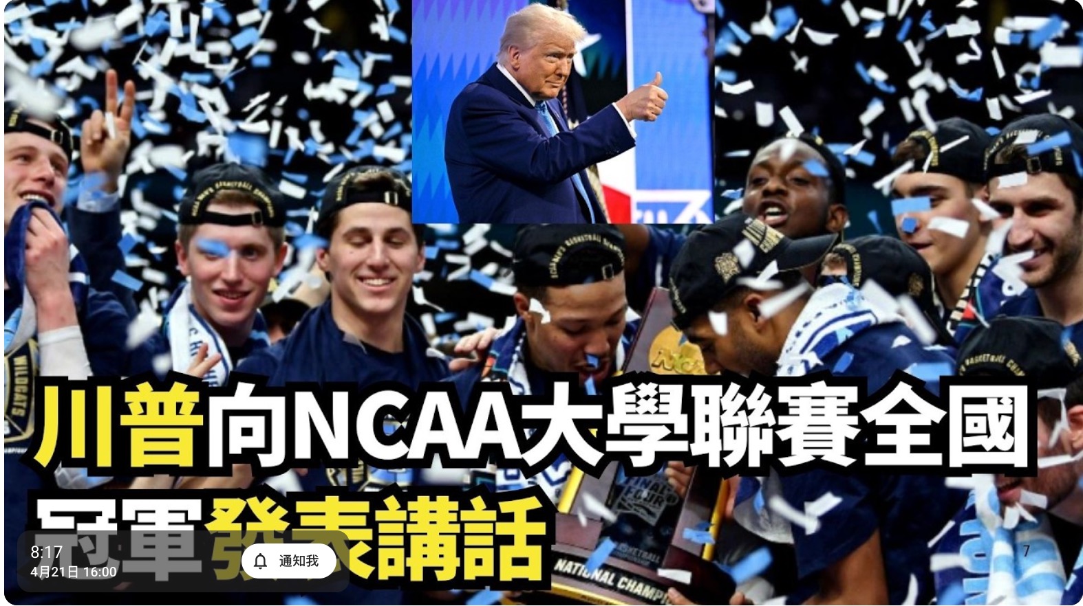 【新唐人北京時間2026年04月22日訊】美東4月21日下午,美國總統唐納德·川普向NCAA大學聯賽全國冠軍發表講話。新唐人、大紀元進行網絡直播,即時翻譯字幕。