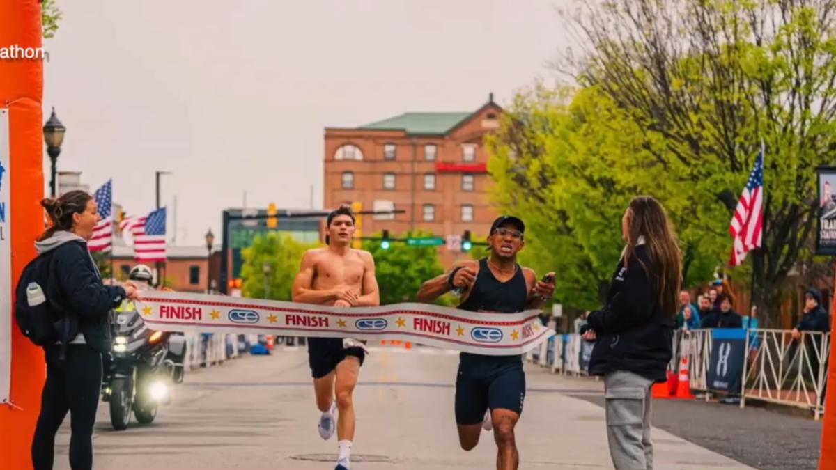 這一幕發生在4月19日的特拉華馬拉松賽場上,當時選手卡森・梅洛(Carson Mello)已接近終點線,只見他高舉雙手、放慢腳步準備迎接勝利。