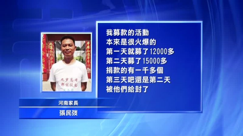 河南家长张民弢:“我募款的活动本来是很火爆的,第一天就募了12000多,第二天募了15000多,捐款的有一千多个,第三天吧还是第二天被他们给封了。”