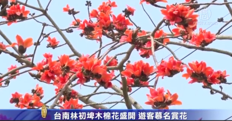 台南白河林初埤的木棉花道,将近1.6公里长,沿路两旁种了800多株的木棉树,木棉花绽放放的时候,不只吸引民众前来赏花,树枝上也有许多鸟类嬉戏栖息。木棉花期将持续到3月底,不想错过美丽景色的民众可得把握时机。