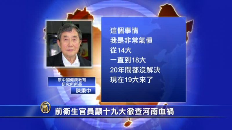 【新唐人2017年10月10日讯】中共前卫生部高官陈秉中日前投书海外《维权网》,呼吁习近平当局在即将召开的中共十九大报告上,增添“一定要将河南血祸彻查到底”的内容,以体现取信于民的决心。