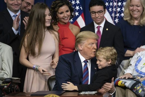 签字仪式上,平易近人、颇接地气的川普走到8岁的小男孩麦克林(Jordan McLinn)面前,拉住他的手,然后走回讲台幽默地赞赏这位小帅哥:“如果我长得像他那样,我也许提前10年就当总统了。”