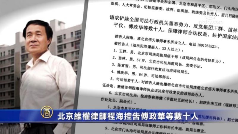 【新唐人北京时间2019年09月09日讯】北京维权律师程海,曾经代理过王全璋、法轮功等敏感案件,去年遭到当局注销他的律师事务所和律师执业证书。程海因此对中共司法部部长傅政华,北京市、昌平区司法局以及北京市律师协会等数十人提出控告,请求铲除全国司法机关的黑恶势力。