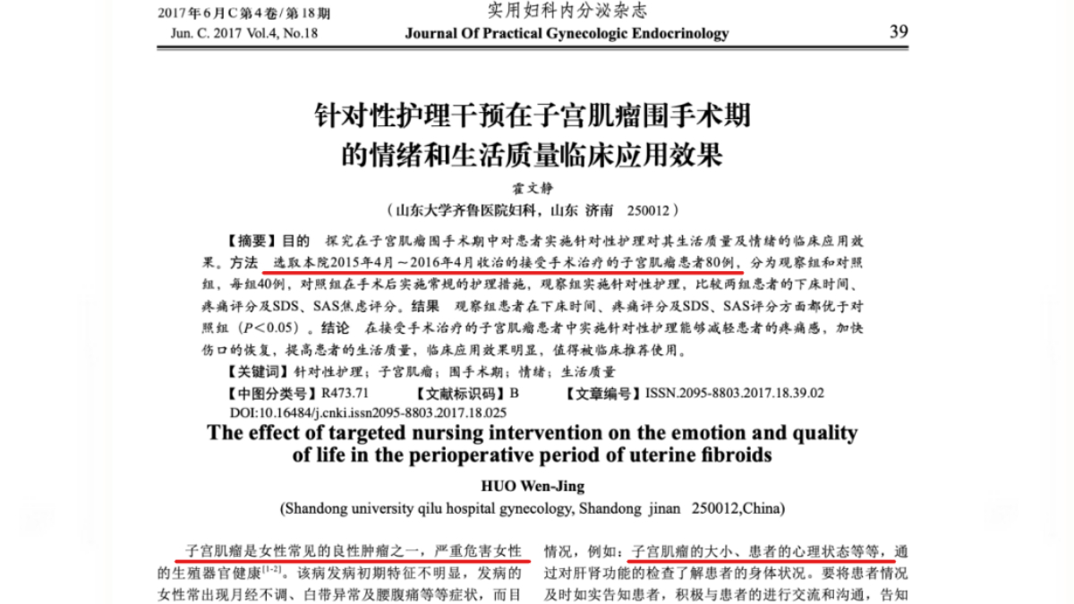 近日,一篇题为《针对性护理干预在子宫肌瘤围手术期的情绪和生活质量临床应用效果》的论文在网络流传,引发关注。