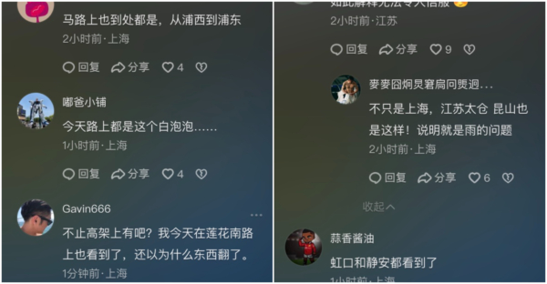 上海当地网友说,上海多个区多条道路都出现这个现象。“今天路上都是这个白泡泡······”“马路上也到处都是,从浦西到浦东”“虹口和静安都看到了”“不止高架上有吧?我今天在莲花南路上也看到了,还以为什么东西翻了”“不只是上海,江苏太仓 昆山也是这样!”“沈海高速也有”“宝山也有”。