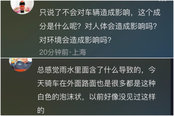 网友质疑说,“如此解释无法令人信服。”“只说了不会对车辆造成影响,这个成分是什么呢?对人体会造成影响吗?对环境会造成影响吗?”“我活了四十岁第一次听说下小雨还有泡沫。”
