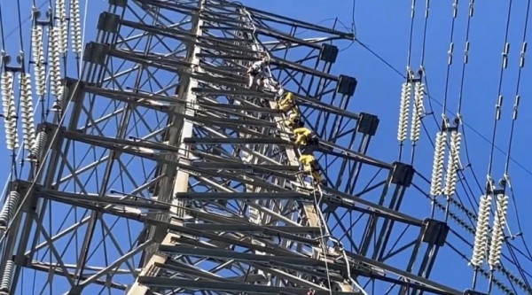 今天上午6时由台电人员先上塔断电,消防局再出动空拍机接近高空,由4名特搜人员爬上高压电塔。