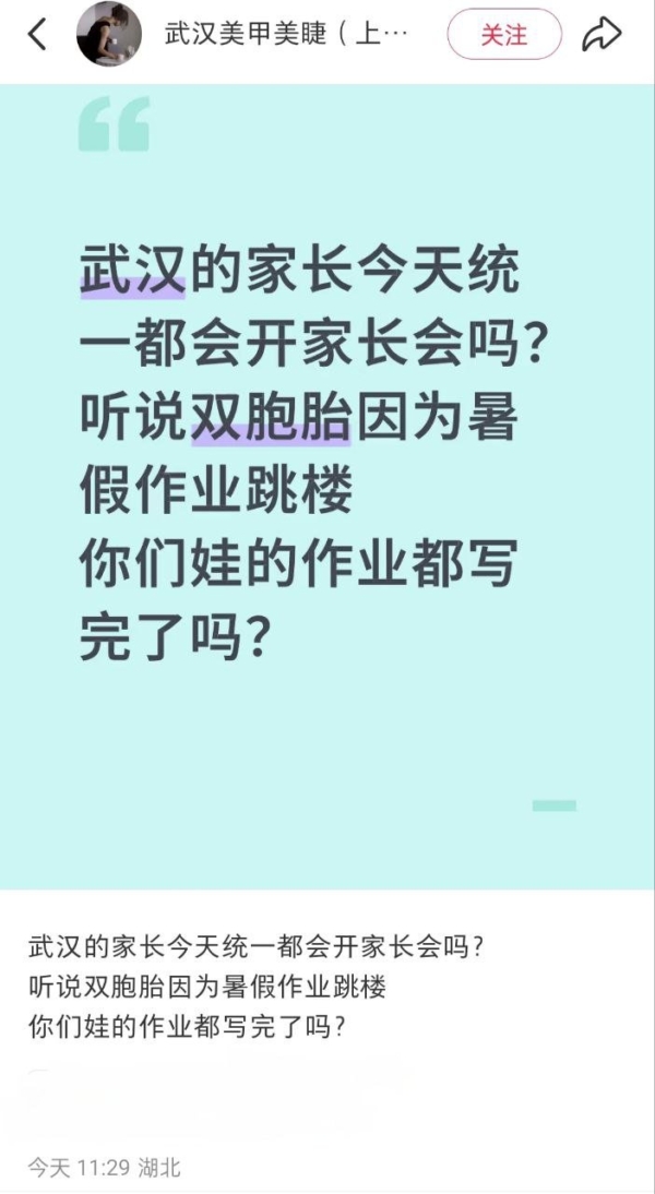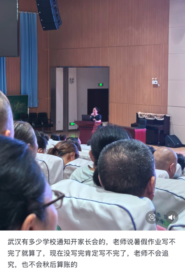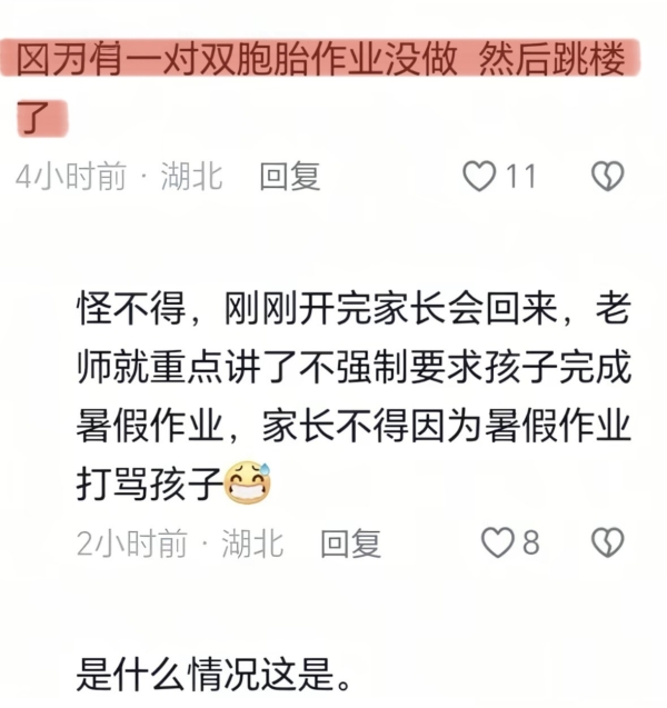 网络热传这一波家长会可能是官方要求,原因是青山区一对双胞胎因为没有写完暑假作业,在压力下双双跳楼身亡。