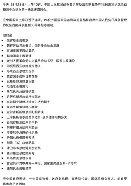 中共定于9月3日在天安门广场举行所谓的“抗战胜利80周年阅兵”,8月28日下午,中共外交部在例行的新闻发布会上,公布了参加九三阅兵的外宾名单,其中包括俄罗斯的普京、朝鲜的金正恩,以及柬埔寨、越南、伊朗、古巴、缅甸等国领导人,但名单中未见西方主流国家政要,引发外界关注。