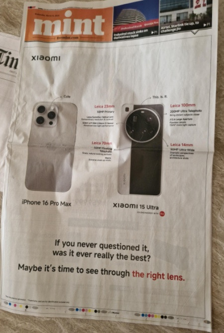 4月1日,小米刊登了整版广告,向相信iPhone 16 Pro Max的相机可以与小米15 Ultra匹敌的读者致以“愚人节快乐”的祝福。
