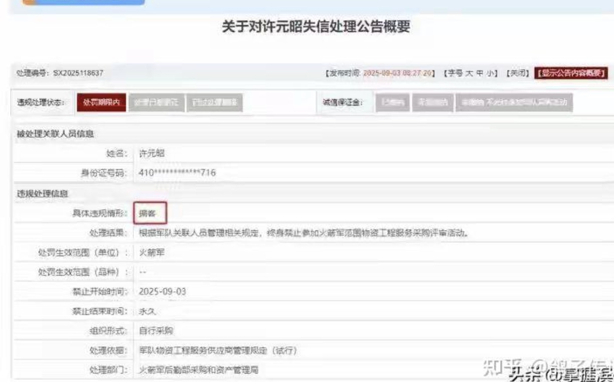 有一位名为“许元昭”的专家具体违规情形被指“掮客”,于2025年9月3日被终身禁止评标资格。他控股或管理的企业也禁止参加军队采购活动,同时也终身禁止他代理其他供应商参加军队采购活动。