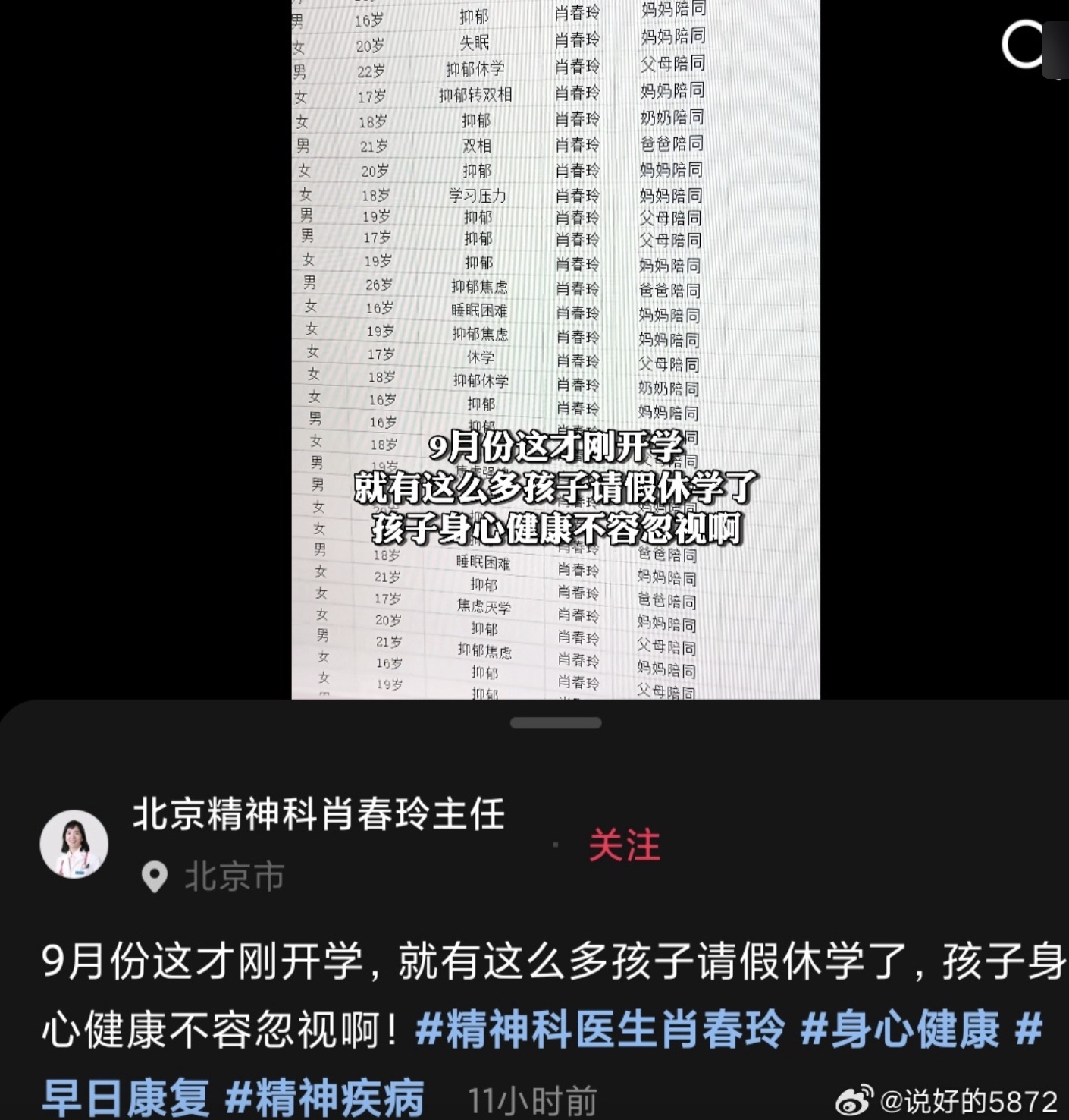 9月16日,抖音账号名为“北京精神科肖春玲主任”的医生发布视频说,“9月份才刚开学,就有这么多孩子请假休学了,孩子身心健康不容忽视啊”。