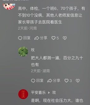 “上学苦,高中,体检,一个班60、70个孩子,有不到10个没病,其他人老师发信息让家长带孩子去医院看医生。”