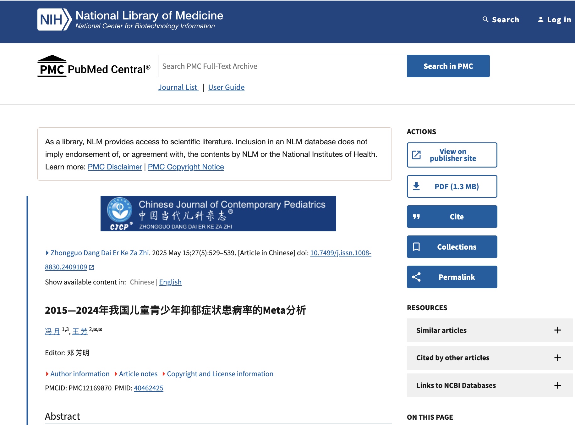 但在2025年5月15日,一篇发表在《中国当代儿科杂志》上的题为《2015—2024年我国儿童青少年抑郁症状患病率的Meta分析》的文章指出,Meta分析结果显示,中国儿童青少年抑郁症状的患病率为23.3%,并且,抑郁症状的患病率随着年级的升高而呈现上升趋势。