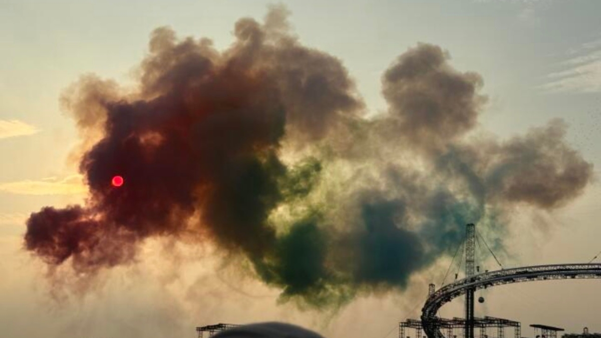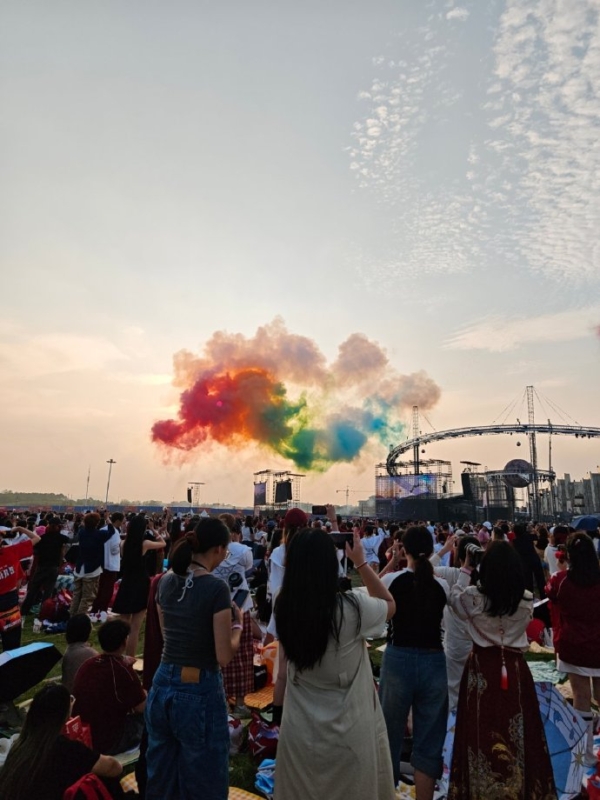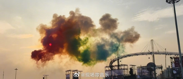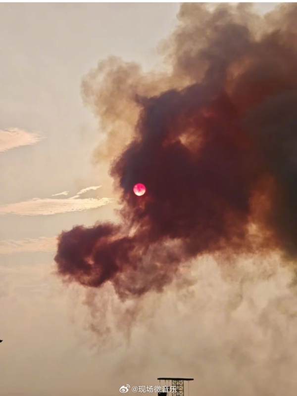 视频和现场画面显示,当日下午演唱会中,华晨宇团队燃放的彩色烟花轨迹在空中自然舒展成金色巨龙轮廓,而西沉的太阳恰好悬停于“龙头”正中央,形成天然的“龙眼”效果。