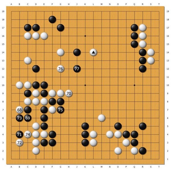 本局丁浩执黑,以较为少见的对角星开局,金志锡应以对角小目。序盘,白棋抢占了三个角地,黑棋则在左下形成庞大模样。于是,金志锡侵消黑阵,展开激战。
