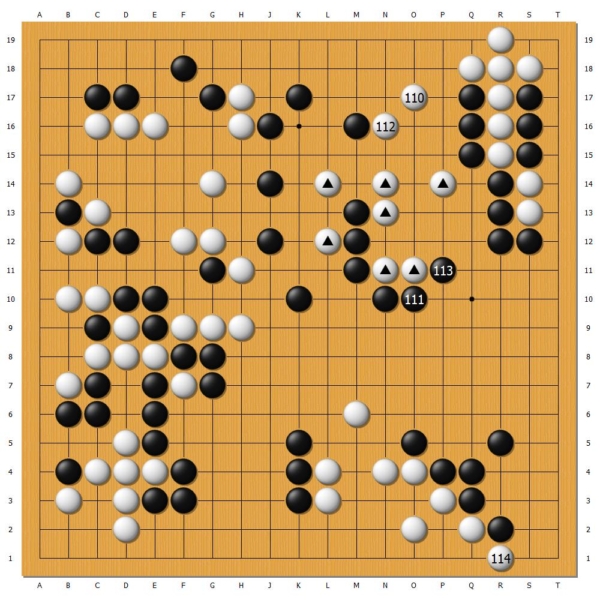 正当黑棋应大举进攻之际,第111、113两手棋却突然鸣金收兵,放虎归山。白棋轻松连络,解除了心头大患,成为本局的转捩点。廖元赫抢到白114扳这个大官子,同时安定了下方白棋,短短两个回合就扭转了此前的颓势。