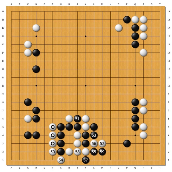 在比拼力量上,年轻的丁浩更胜一筹。白50夹,不愿舍弃白三子,似出现误算。实战,黑棋恰好能封住下方实空。