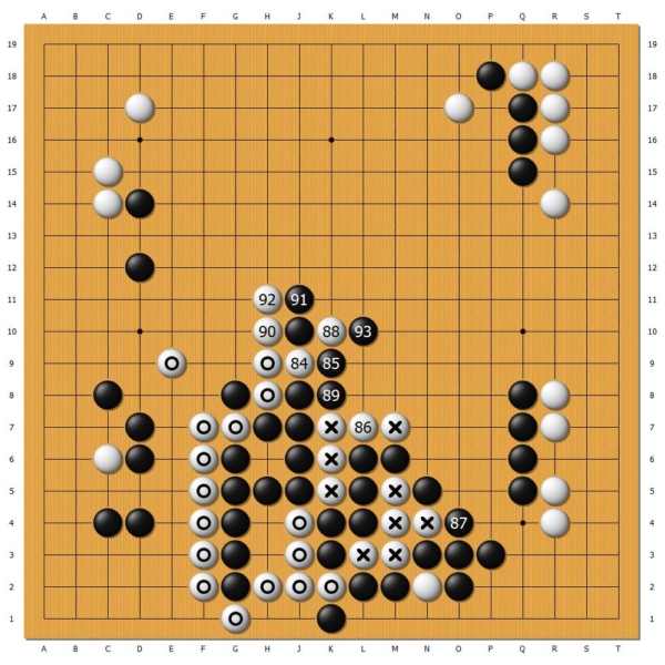 为冲出包围圈,至黑93手,白大龙只能丢卒保车,弃掉数子,损失较为惨重。丁浩就此奠定优势。