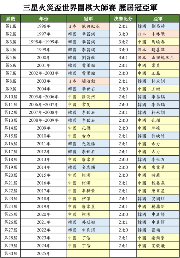 决赛为三番胜负,将于16日至18日进行。目前中国大陆棋手已连续三届包揽冠亚军,无论决赛结果,这是他们第14次登顶,追平了韩国棋手的夺冠次数。