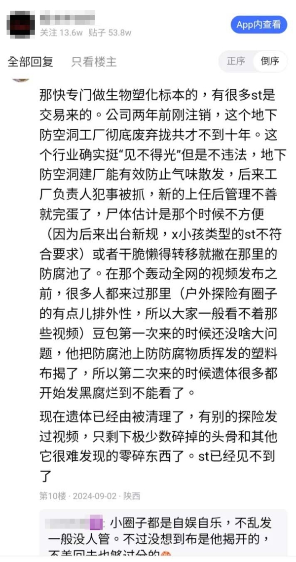 上述视频刚刚曝光时,还有网军“洗地”,声称是医院废弃的实验室,里面的尸体是捐献的。不过知情网民透露,该防空洞原来是一个制造生物塑化标本公司的加工厂。后来公司倒闭,这些尸体就直接扔在那里不管了。