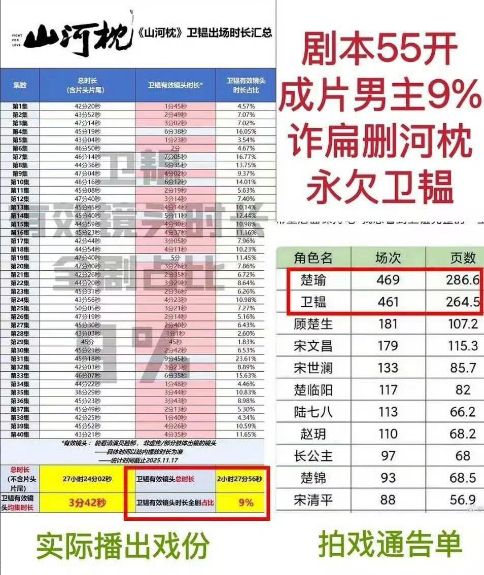 有粉丝计算,丁禹兮在担任客串角色的《淮水竹亭》中的有效镜头时长为2小时26分,对比《山河枕》的2小时27分钟,直呼“这哪是男主,分明是特邀客串”“片名应该改成‘删河枕’”。