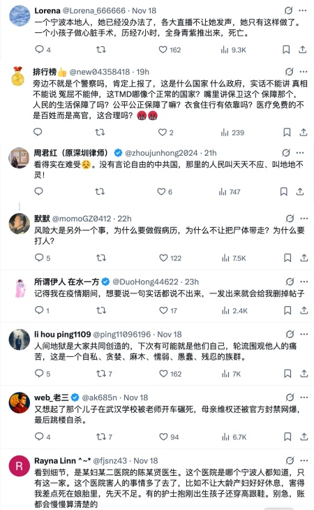 有知情网友留言说:“一个宁波本地人,她已经没办法了,各大直播不让她发声,她只有这样做了。一个小孩子做心脏手术,历经7小时,全身青紫推出来,死亡。”