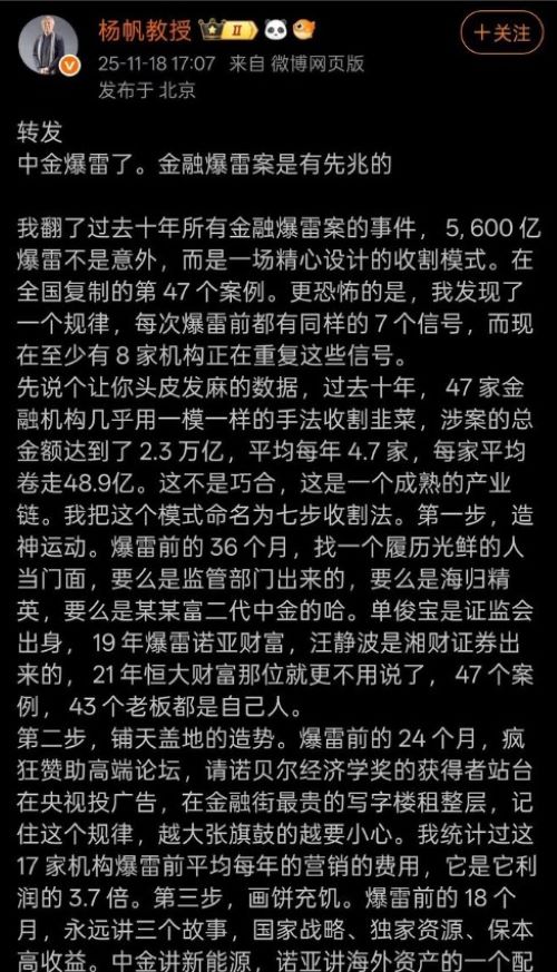 对于前述杨帆贴文的内容,公众号“公子麦少”11月20日发文感慨道:这哪是投资?分明是围猎。你以为自己在理财,其实你才是“理财产品”。