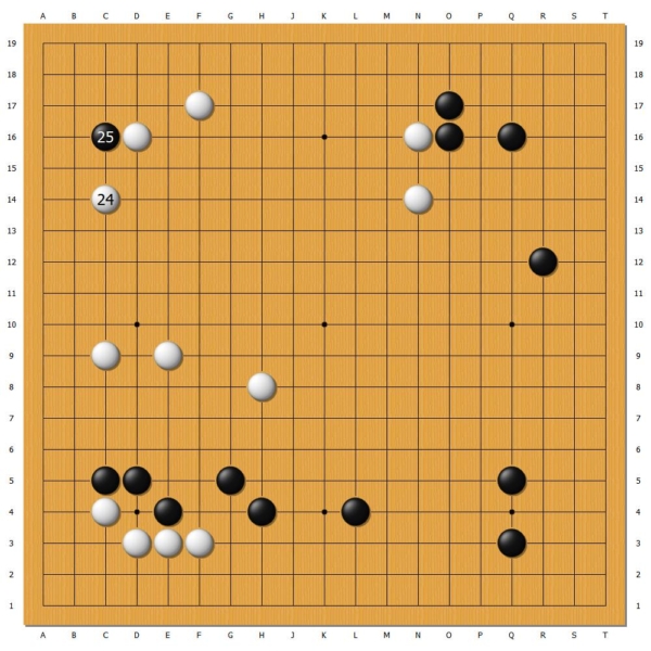 本局芝野虎丸执黑先行,序盘二人互围模样,黑25托入白左上角,意欲洗劫白棋模样。