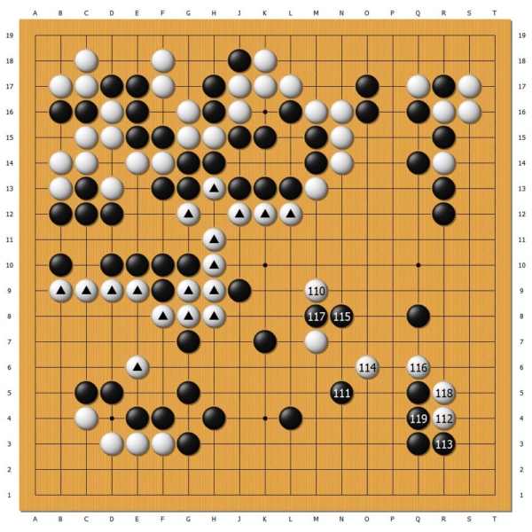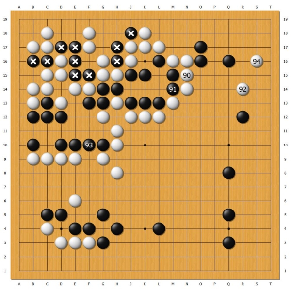 在白棋的强力攻击下,行至第93手,黑大龙左冲右突,弃掉上方残子后,得以做活。AI显示,此时白棋实空与外围兼得,胜率已达八成。