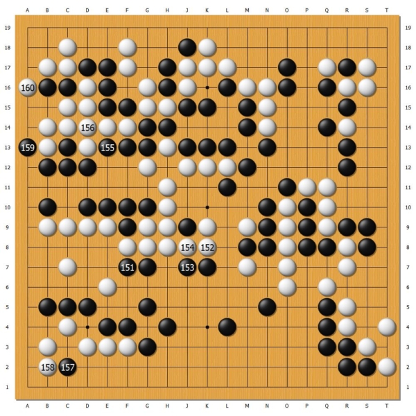 不过,芝野虎丸未能如上一局弈出最强手段,给了杨楷文喘息的机会。实战,白棋将两块棋分别做活,奠定胜局。芝野虎丸未做过多纠缠,仅160手就推枰认输。