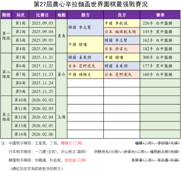 【新唐人北京时间2025年11月23日讯】11月23日,第27届“农心杯”三国围棋擂台赛第7局比赛结束,首度参赛的中国大陆世界冠军杨楷文,中盘战胜日本“十段”芝野虎丸,取得开门红。24日,韩国队三将安成浚将登场攻擂。